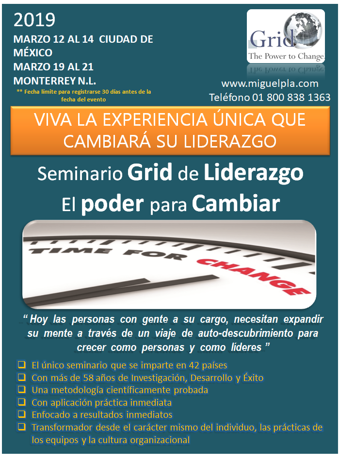 Le escribe su servidor Miguel Angel Pla Ph.D, Presidente y Director General de MIGUEL PLA CONSULTORES y GRID INTERNATIONAL para América Latina. Con gusto le hago llegar la información del Seminario Grid de Liderazgo El Poder para Cambiar *** Ver información completa del seminario en :